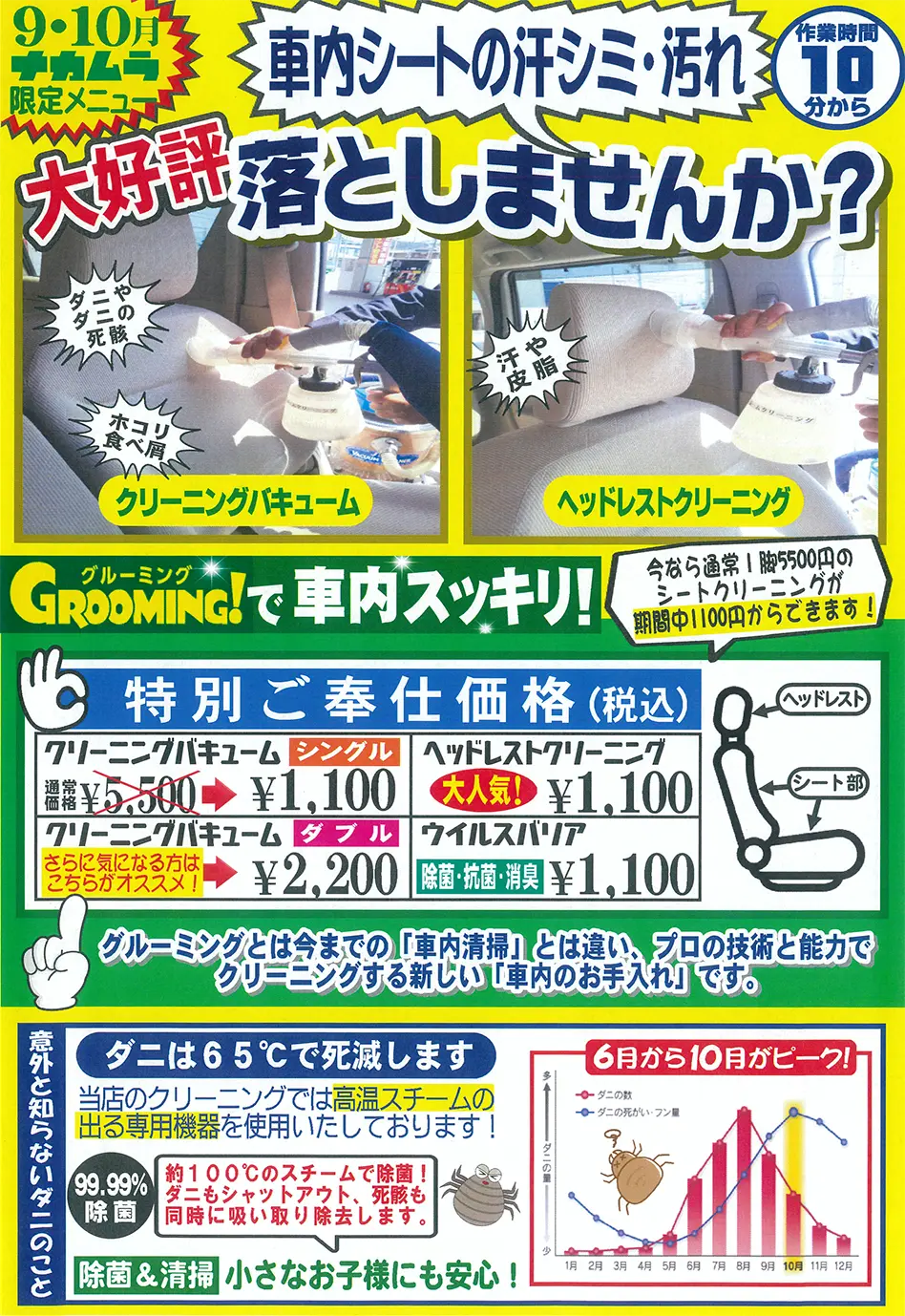 9月・10月限定メニュー、クリーニングバキューム、ヘッドレストクリーニングを特別ご奉仕価格で実施中。