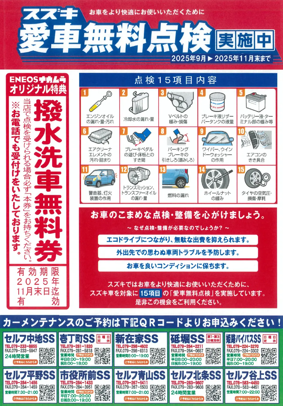 お車のこまめな点検・整備を心がけましょう。スズキ愛車無料点検実施中です。ただいま撥水洗車無料券進呈中。